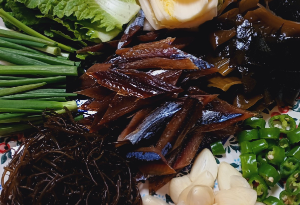 - 향신채 향이 나면 과메기를 넣고 볶는다.