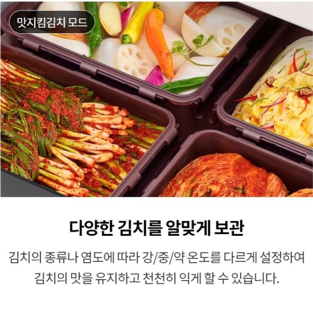 - 내부는 상칸, 중칸, 하칸으로 나뉘어 있는데, 상칸에는 김치통이 없고 중칸과 하칸에만 있어요. 요즘은 예전처럼 김치를 많이 담가 먹지 않기 때문에, 김치냉장고를 다용도 냉장고처럼 사용합니다. 상칸을 냉동, 냉장, 김치 보관 모드로 변환할 수 있어서 김치가 많지 않을 때는 중칸과 하칸에 김치를 보관하고 상칸을 냉장이나 냉동으로 활용하면 훨씬 효율적으로 사용할 수 있답니다. 김치통이 부족하다면 필요한 만큼 추가 구매해서 사용하는 게 더 효율적이에요.